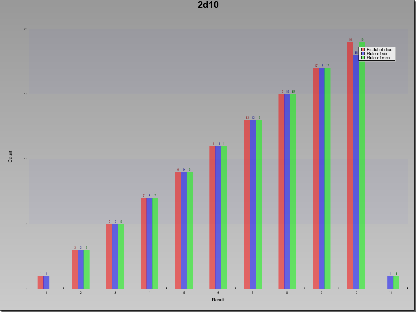 | Result | Fistful of dice | Rule of six | Rule of max | Result | |||