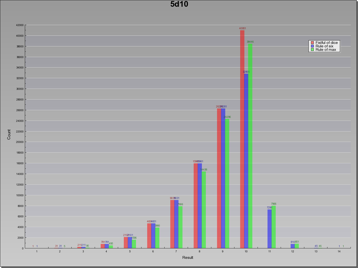 | Result | Fistful of dice | Rule of six | Rule of max | Result |