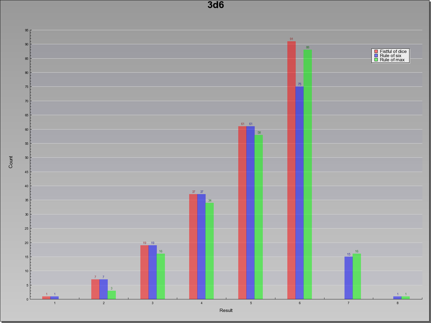| Result | Fistful of dice | Rule of six | Rule of max | Result | |||