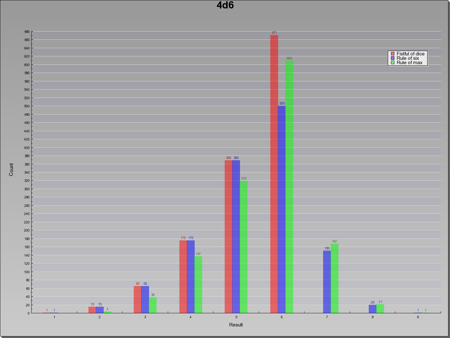 | Result | Fistful of dice | Rule of six | Rule of max | Result | |||