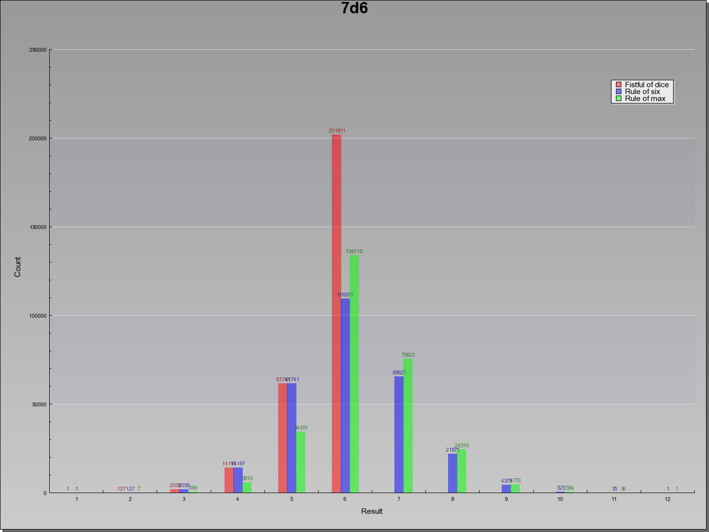 | Result | Fistful of dice | Rule of six | Rule of max | Result |