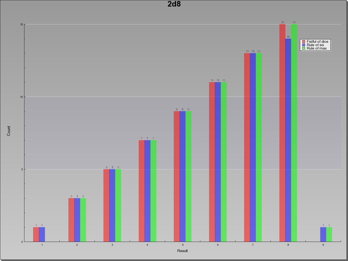 | Result | Fistful of dice | Rule of six | Rule of max | Result | |||