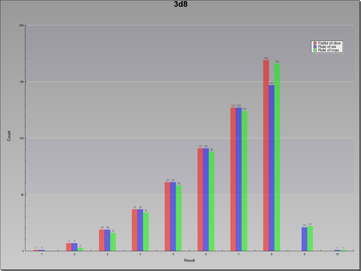 | Result | Fistful of dice | Rule of six | Rule of max | Result | |||