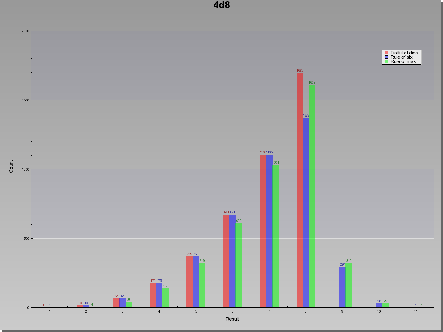 | Result | Fistful of dice | Rule of six | Rule of max | Result | |||