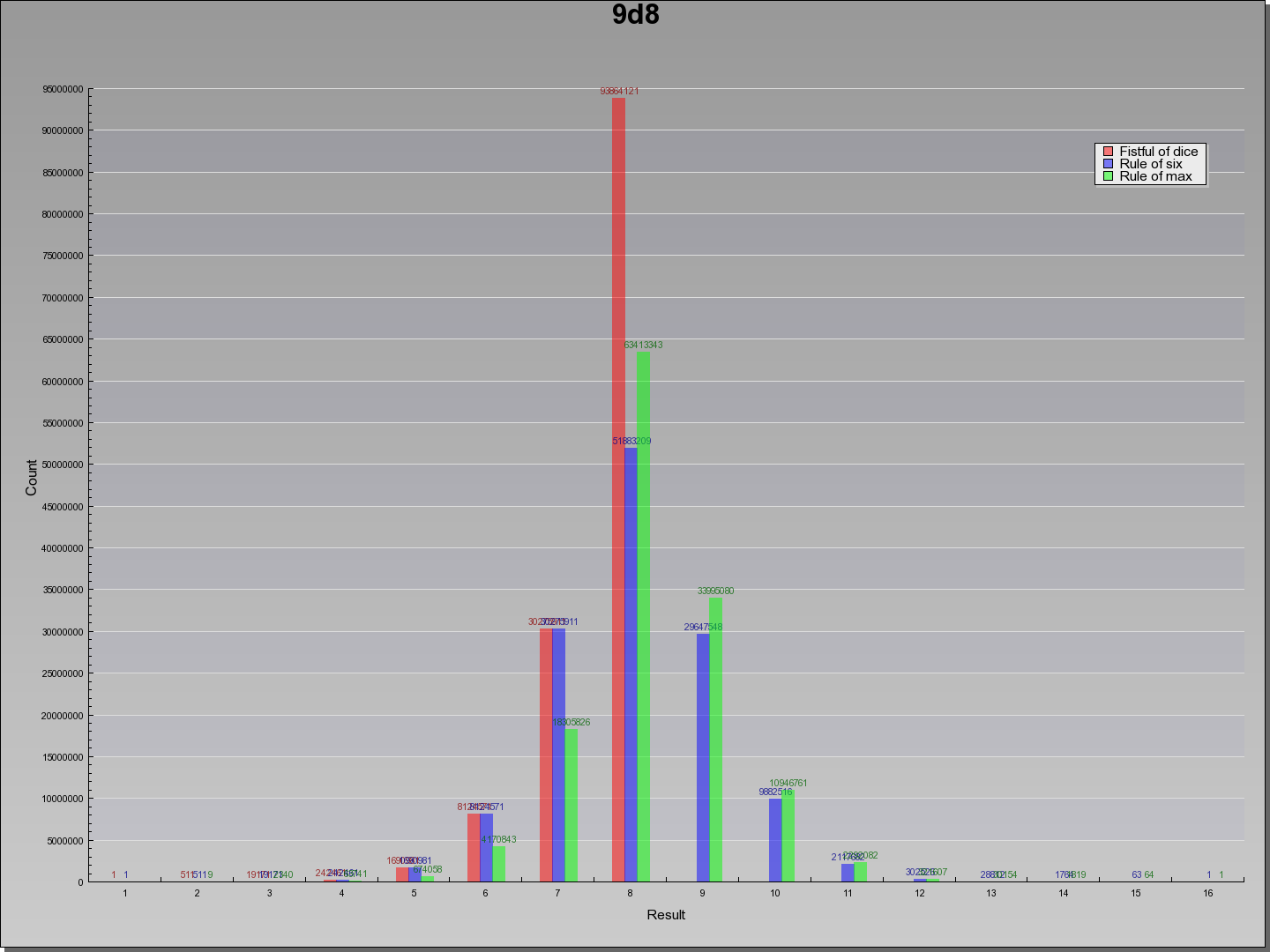 | Result | Fistful of dice | Rule of six | Rule of max | Result |