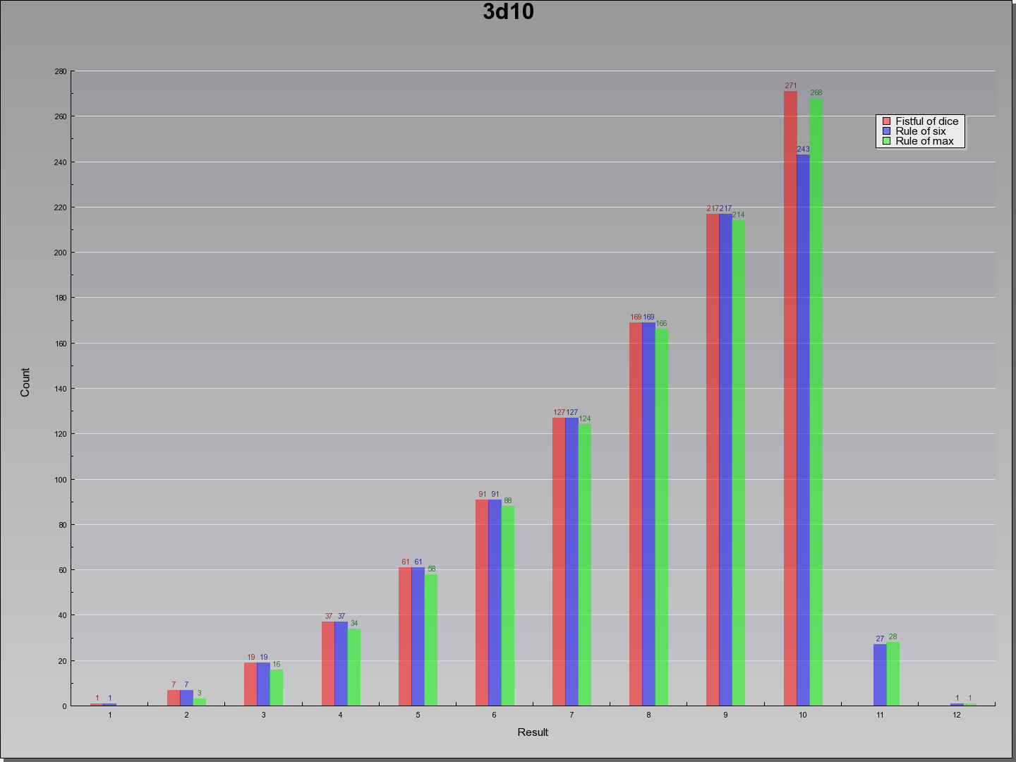 | Result | Fistful of dice | Rule of six | Rule of max | Result |