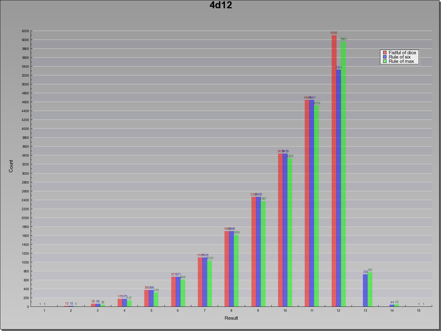 | Result | Fistful of dice | Rule of six | Rule of max | Result |