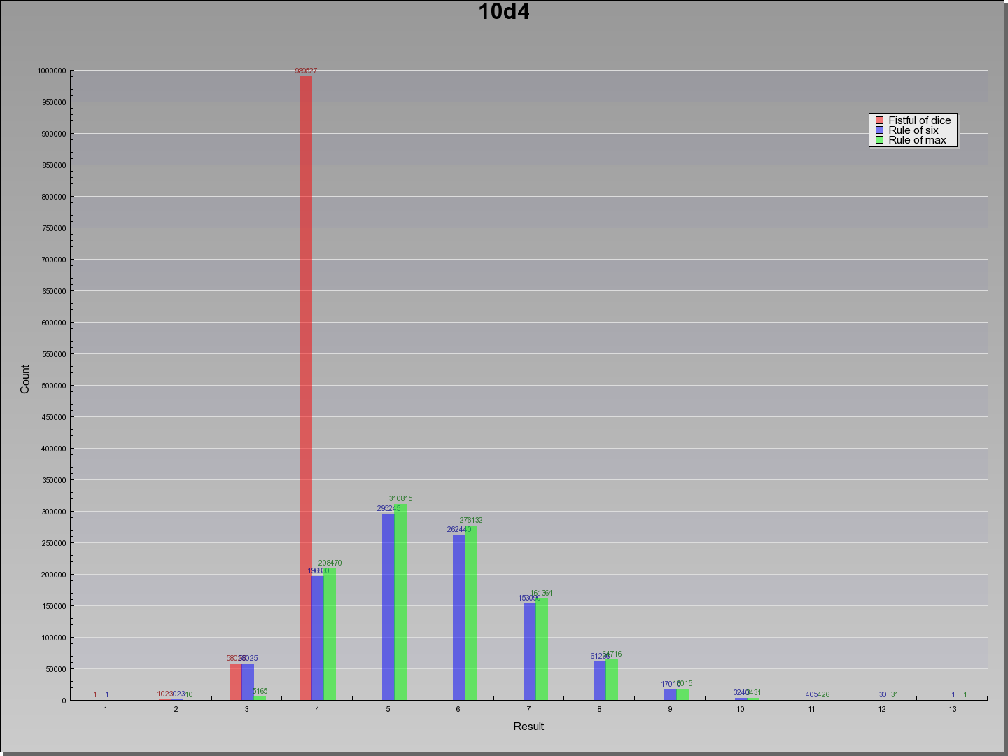 | Result | Fistful of dice | Rule of six | Rule of max | Result |