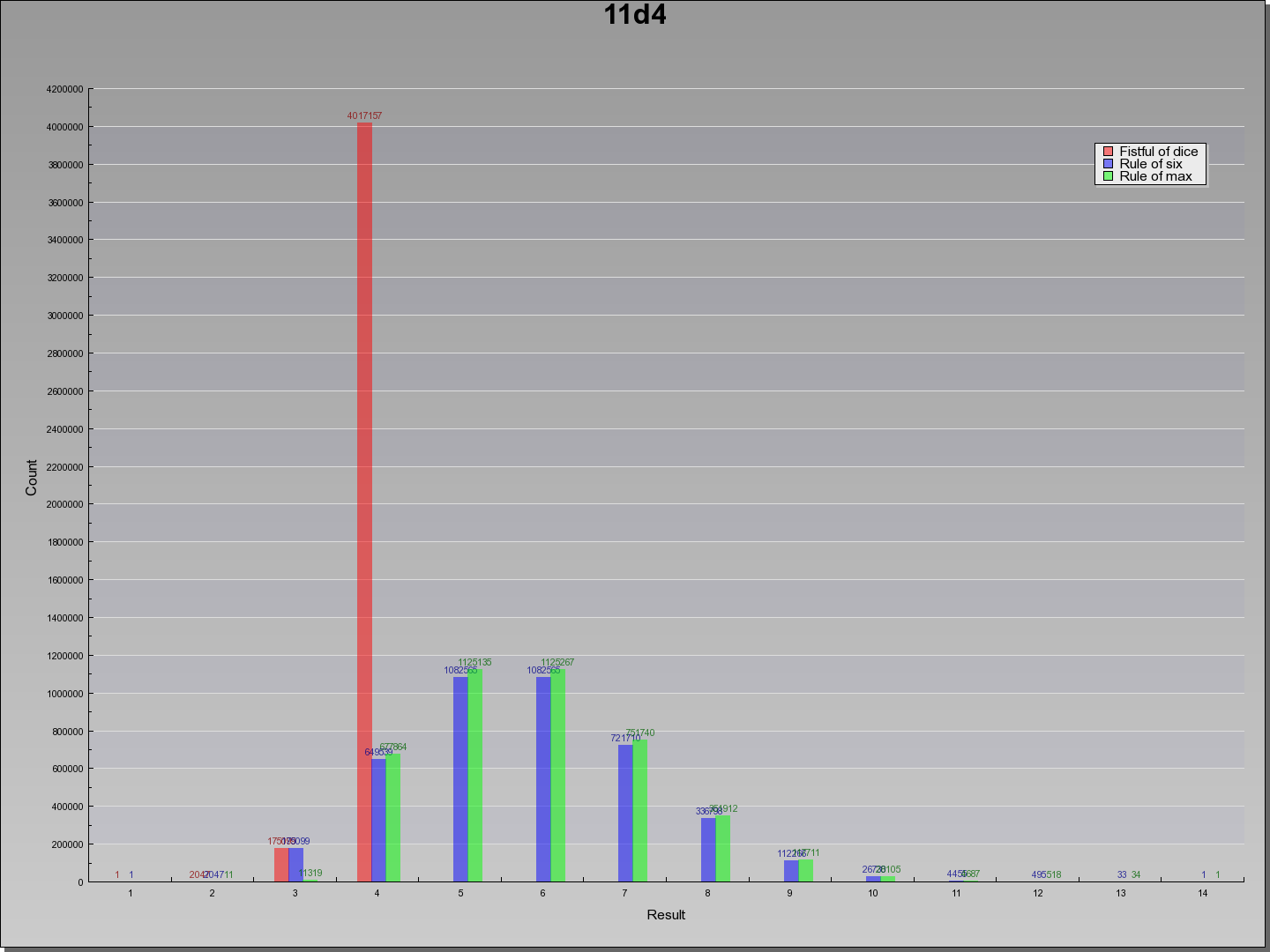 | Result | Fistful of dice | Rule of six | Rule of max | Result |