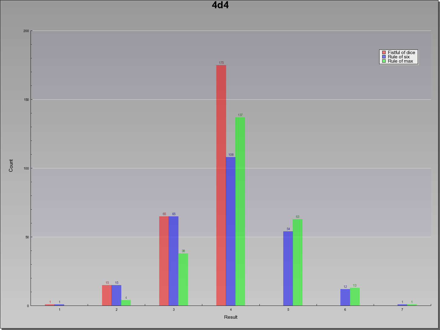 | Result | Fistful of dice | Rule of six | Rule of max | Result | |||