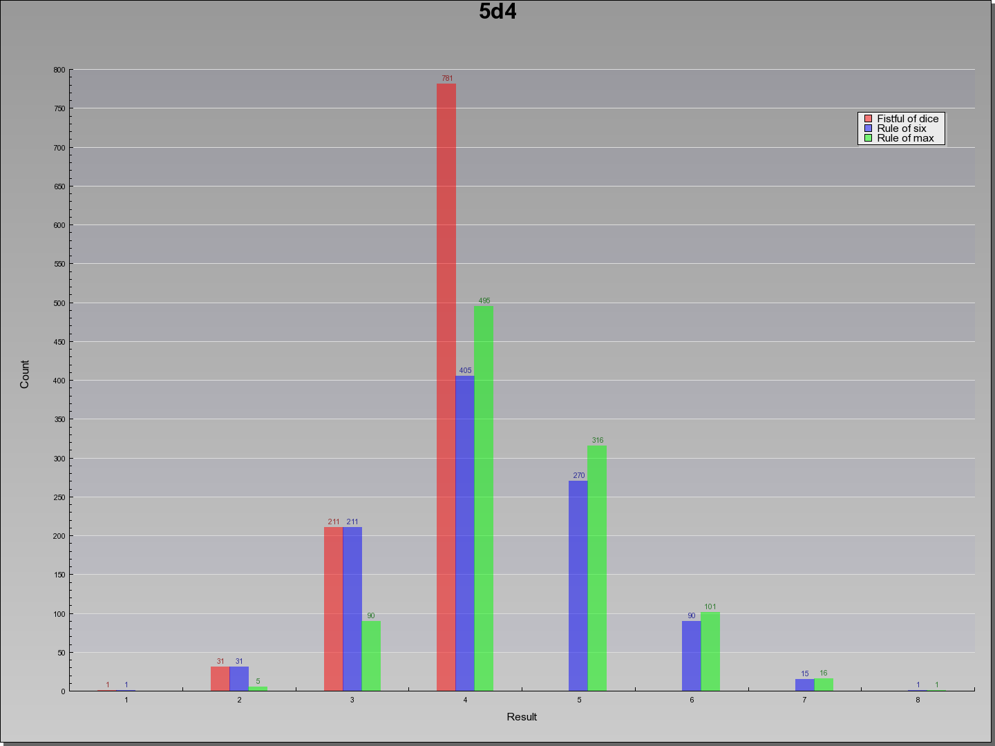 | Result | Fistful of dice | Rule of six | Rule of max | Result | |||