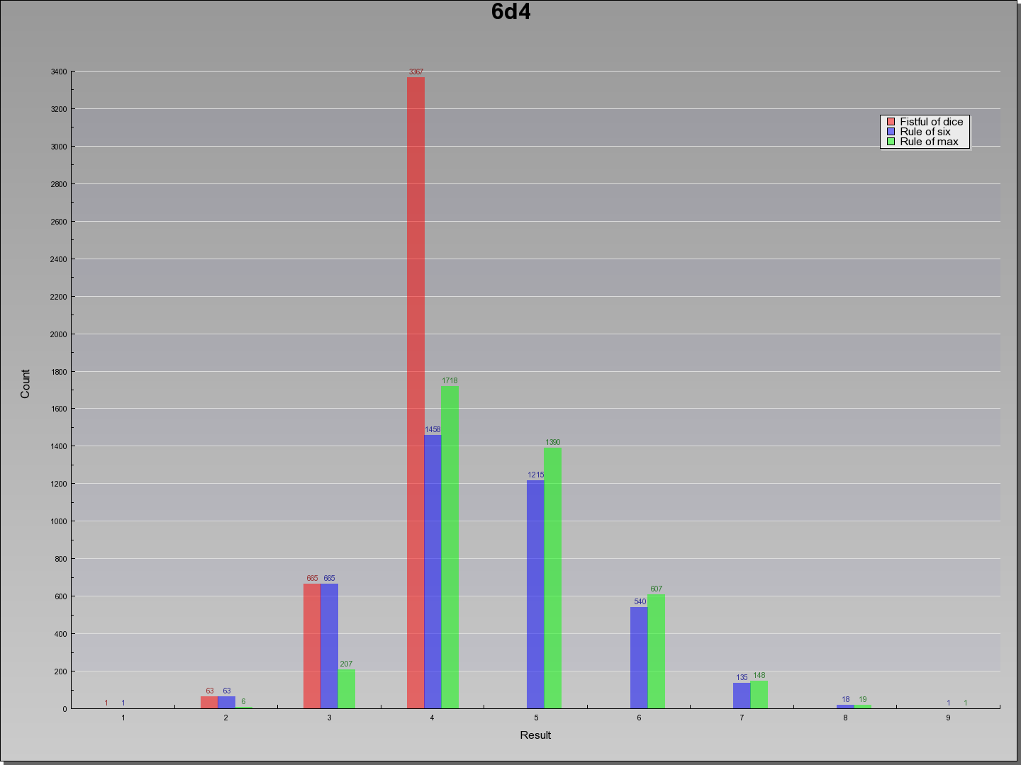 | Result | Fistful of dice | Rule of six | Rule of max | Result | |||