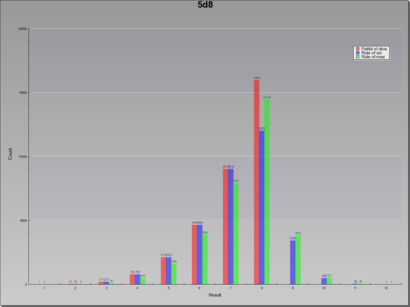 | Result | Fistful of dice | Rule of six | Rule of max | Result |